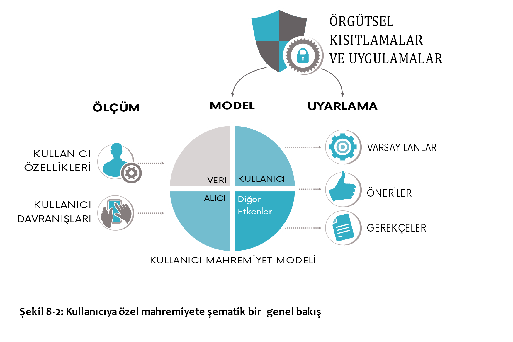 Kullanıcıya özel mahremiyet, kullanıcıların mahremiyete ilgili karar verme uygulamalarını desteklemek için yeni bir araçtır23. Kullanıcı tarafından tasarlanan gizlilik tabanlı bir sistem önce kullanıcıların mahremiyete ilgili özelliklerini ve davranışlarını ölçmekte, sonra bunu gizlilik tercihlerini modellemek için girdi olarak kullanmekte ve son olarak sistemin gizlilik ayarlarını bu tercihlere uyarlar (bk. Şekil 8-2).